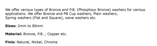We Offer bronze Washers Phosphour bronze Washers Bronze Spring Washers DIn 125 bronze washers for various electromechanical applications. We have various pressing machines to knock out best quality Bronze Washers Phosphour bronze Washers lock washers cup washers machined washers Lock washers bronze Parts bronze components and fittings. Thickness of PB washers bronze Washers Phosphour bronze Washers: from 0.3mm to 5mm We also offer custom amde Bronze washers and bronze lock washers to DIn 125 DIn 126 DIn 127 spring washers etc.